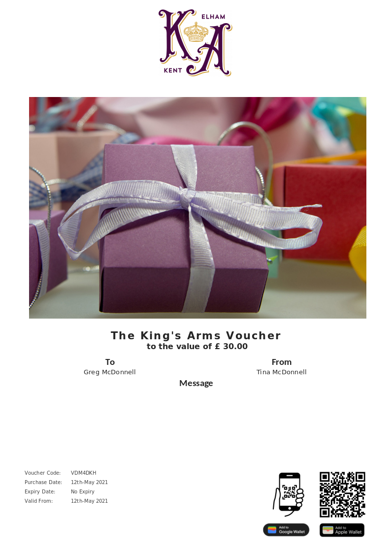 The Kings Arms allows you to purchase instantly printable gift vouchers, special offers and tickets using the Voucher Connect platform.
